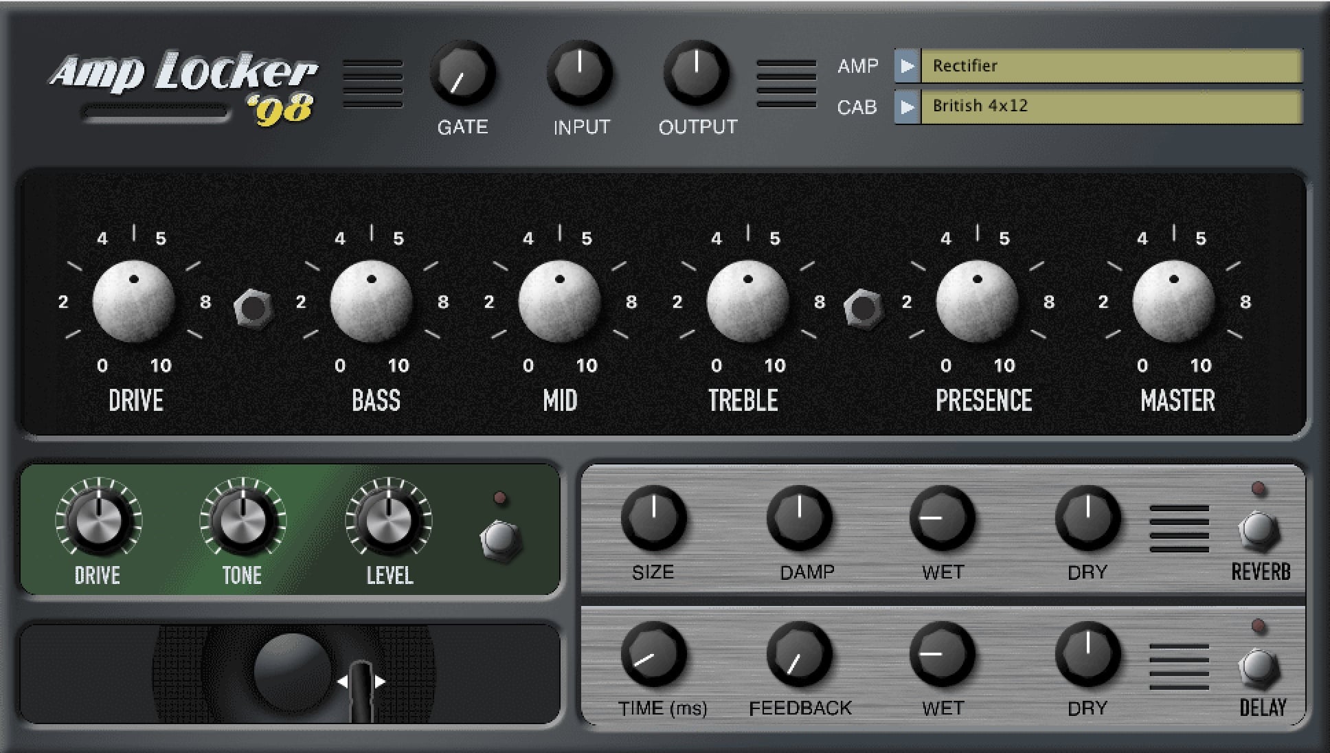 Amp Locker 98 includes six amplifier models. Each model features independent Gain, Bass, Mid, Treble, Presence and Master controls.