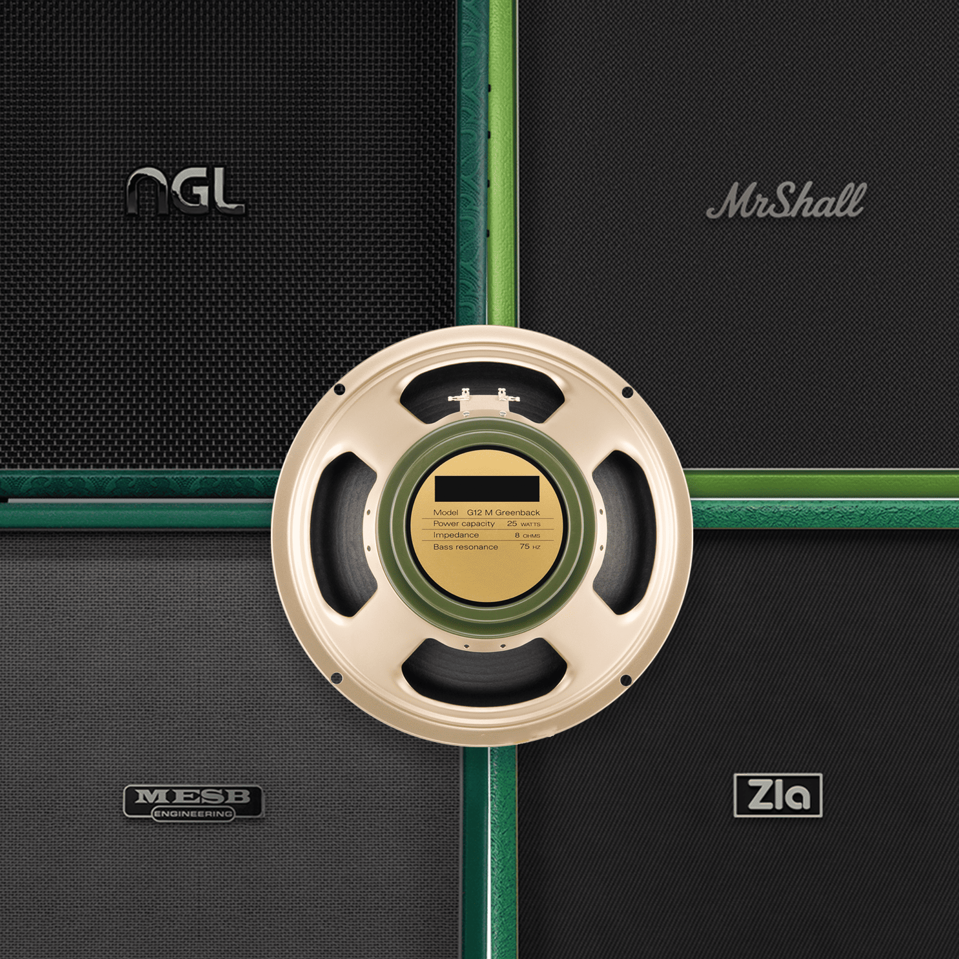 Loaded with 4 different cabs using a 90s CELESTION GREENBACK with 6402 CONE aka "THE MODERN GREENBACK".